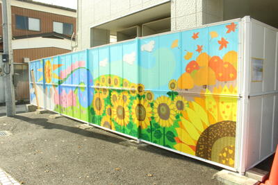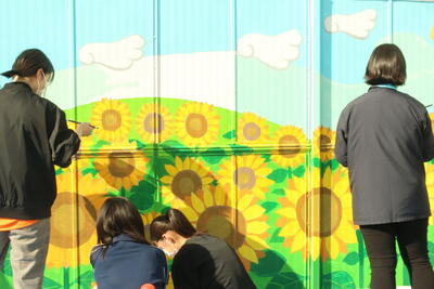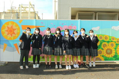 11月13日に高齢者介護施設「にこトピアいわで」の白い金属塀への壁画アートが完成し,お披露目会を迎えました。夏休み明けから少しずつプロジェクトがスタートし,美術部員だけでなく有志の生徒も加わり,土曜日の活動に意欲的に参加してきました。