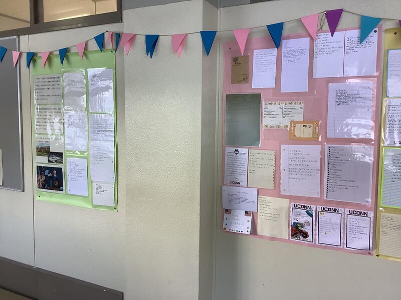 10月から英語の先生の発案で,1年生の「コミュニケーション英語基礎」の授業と3年生の選択「英語会話」の授業内でコネチカット大学の初級日本語を受講している学生と手紙の交換を行っています。お互いに自分の好きなものを英語・日本語で手紙を作成し,それに加えてイラストや折り紙など工夫を凝らしたプレゼント交換もエアメールで交わし,本校の生徒も手紙のやり取りを楽しくしているようです!