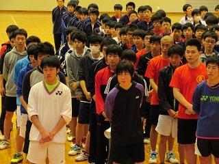 男子団体の対戦相手は,上記の通り,昨秋の新人戦で敗退している古川学園高校でした。バドミントンの団体戦は全部で5試合(第1ダブルス,第2ダブルス,第1シングルス,第2シングルス,第3シングルス)を行い,そのうち3勝を先に獲得した方が勝利となります。第1ダブルスでは,いずれも3年生の畑中極さん(古川中出身)・佐々木雄太さん(古川南中出身)ペアがファイナルゲームまでもつれたものの内容的には圧倒し,ゲームカウント2-1で勝利しました。つづく,第2ダブルスでは,3年生の佐藤悠人さん(岩出山中出身)・1年生の小松田陸来さん(古川中出身)ペアが出場しましたが,バドミントンをはじめてまだ1ヶ月あまりの1年生とのペアということもあり,善戦むなしく敗退しました。つづく第1シングルスでは,3年生の木村友哉さん(岩出山中出身)が出場し,ゲームカウント2-0のストレートで勝利し,全体の勝利数を2-1とリードしました。団体戦勝利へあと1勝と王手をかけてむかえた第2シングルスでは,男子バドミントン部の部長でもある畑中極さんが出場しました。畑中さんは序盤から積極的に攻め込み,中盤やや押される場面もありましたが,最終的にはゲームカウント2-0で下しその責任をきっちりと果たしました。その結果,全体の勝利数を3-1とし,見事に昨年秋の新人大会での雪辱を果たしました。