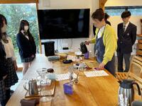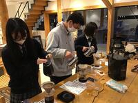 10月15日(水)、本校の魅力化委員会では、ブルーファームカフェ様にご協力いただき、ドリップコーヒーの淹れ方を学ぶ修行を行いました。昨年度も修行を積んだ生徒がおりましたが、今年度はドリップの仕方を一新! 更なるおいしさアップを目指しました。生徒たちは、口当たりがまろやかで、コクがあり、ほんのりとした苦みを感じる、格段に進化したコーヒーの味に「おいしい!」と驚きの表情を見せていました。さらに、試作品として「樹齢130年のリンゴのキャラメリゼとクルミのパウンドケーキ」をごちそうになりました。サプライズのスイーツの登場に、生徒たちはそのおいしさに思わず笑顔があふれるひとときとなりました。