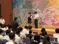 9月3日(水)本校体育館にて、生徒会役員選挙が行われました。生徒会長候補1名、生徒会副会長候補2名が、全校生徒を前に熱のこもった演説を披露しました。それぞれの候補者は、学校生活をより良くするための公約や、自身の学校への思いを力強く語りました。演説中は、候補者たちの真剣な姿に、生徒たちは熱心に耳を傾けていました。演説後、投票が行われました。生徒一人ひとりが、真剣な表情で投票をしていました。