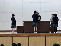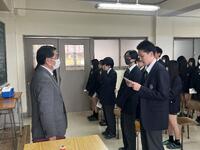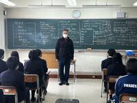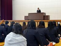 続いて行われた全校集会では、校長先生より2学期の総括と生徒へのメッセージが贈られました。今年度は熊の出没という不測の事態により、伝統行事である仮装行列やマラソン大会が中止を余儀なくされました。校長先生は、楽しみが奪われるという困難な状況にあっても、決して諦めず前向きに学校生活を送る生徒たちの姿を振り返り、「皆さんの姿を心から誇らしく思った」と強い信頼を寄せられました。「思い通りにならないときこそが成長のチャンスである」というお話がありました。 「予期せぬ事態は、新たなアイデアや発見を生み、自分自身を見つめ直すきっかけになる。どんな状況でも挑戦する勇気を持ち続けてほしい」と語りかけていただき、生徒たちの努力と笑顔が、学校のみならず地域社会にとっても大きな「希望」になることへの期待を伝えられました。