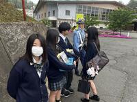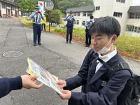 登校時間に合わせて鳴子警察署の方々、地域のボランティアの方2名、そして生徒会3名が正門付近に立ち、自転車の安全な利用について生徒たちに呼びかけを行いました。