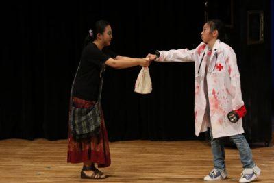 オリジナル脚本は,キャラクターからストーリー展開まで,すべて自分たちで考え,また,大道具や小道具や衣装もすべて準備をします。役につくキャストの他,音響や照明を担当するスタッフも必要なので,それぞれが一役以上の役割を担いながら,60分間に渡って演じきりました。