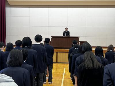 続いて行われた全校集会では、校長先生より2学期の総括と生徒へのメッセージが贈られました。今年度は熊の出没という不測の事態により、伝統行事である仮装行列やマラソン大会が中止を余儀なくされました。校長先生は、楽しみが奪われるという困難な状況にあっても、決して諦めず前向きに学校生活を送る生徒たちの姿を振り返り、「皆さんの姿を心から誇らしく思った」と強い信頼を寄せられました。「思い通りにならないときこそが成長のチャンスである」というお話がありました。 「予期せぬ事態は、新たなアイデアや発見を生み、自分自身を見つめ直すきっかけになる。どんな状況でも挑戦する勇気を持ち続けてほしい」と語りかけていただき、生徒たちの努力と笑顔が、学校のみならず地域社会にとっても大きな「希望」になることへの期待を伝えられました。